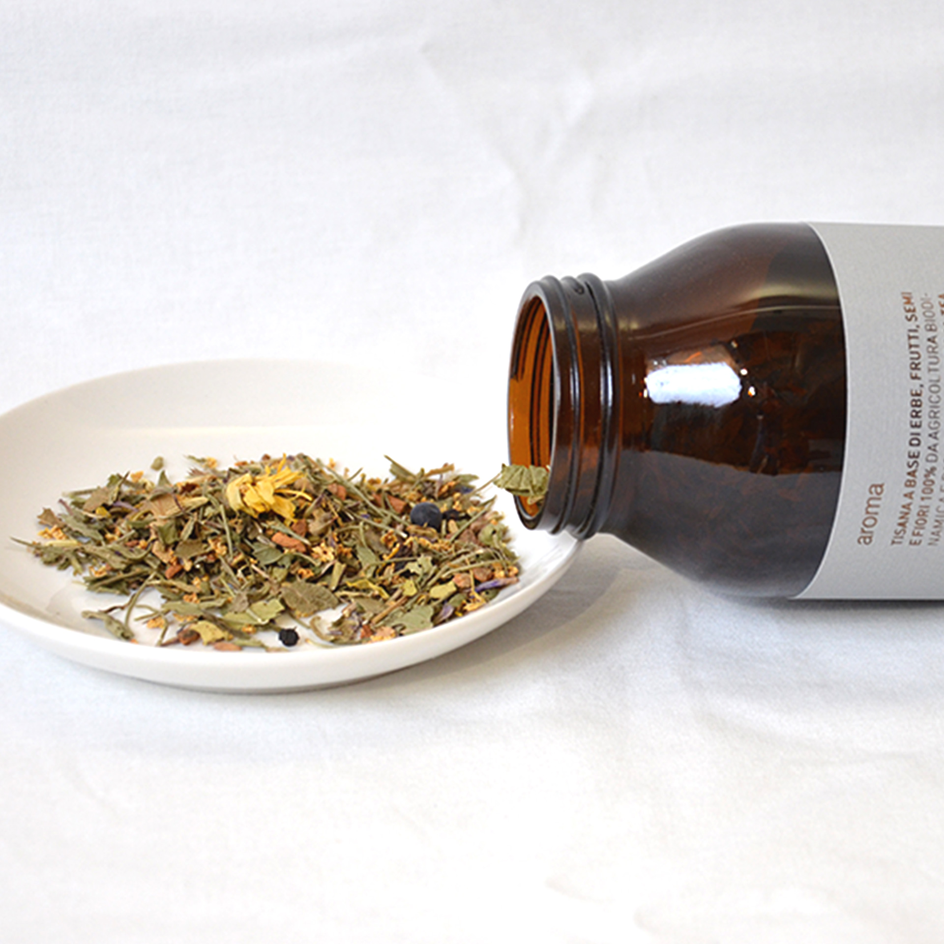 ローズマリーの葉、ニワトコの花、亜麻仁の種、ヒソップの葉、ミントの葉、ブラックカラントの葉、シナモン片、ライムの花、胡椒の実、ゼニアオイの葉と花、マリーゴールドの花、ジュニパーベリー、ウイキョウの種
